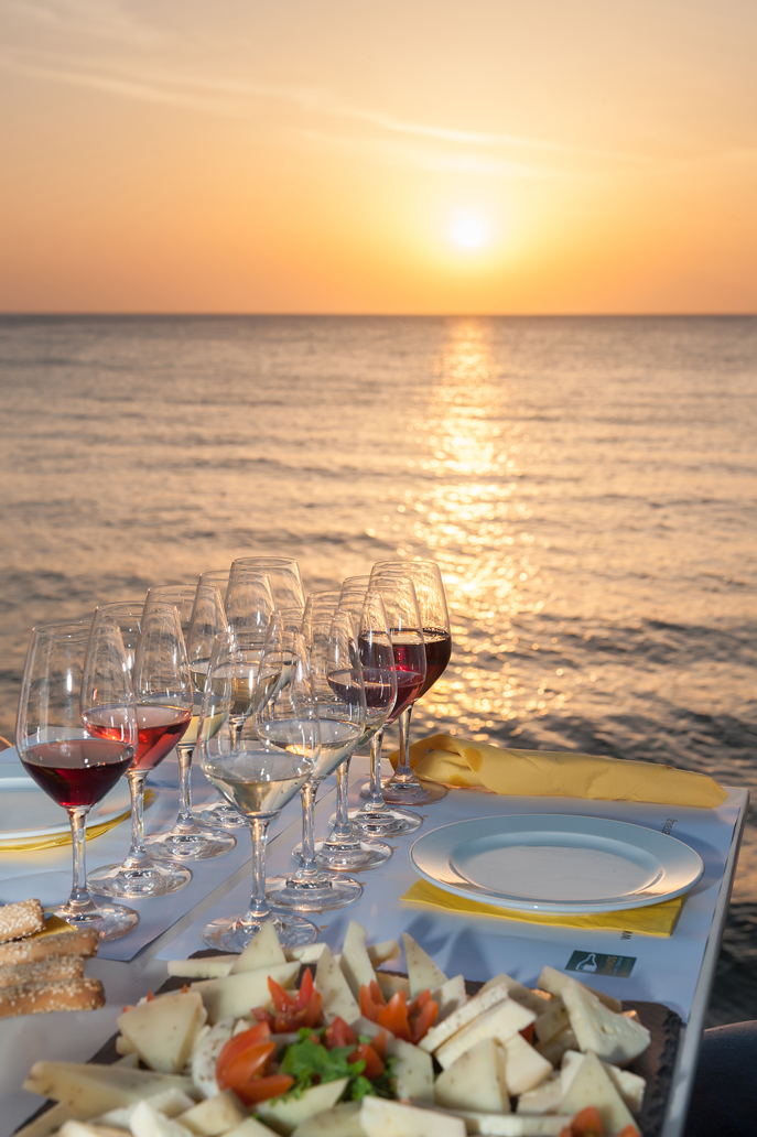 “Wine and cheese pairing by the sea” is a unique wine tasting experience which gives the opportunity to visitors to get familiar with local wine tradition and vineyard of Lemnos and taste local distinctive wines paired with local types of cheese and traditional bread, while watching the sun setting behind Mount Athos.